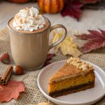 A warm autumn still life with cake, a cup of coffee, a small pumpkin, and fall leaves