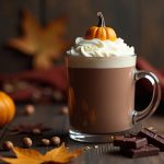 A warm pumpkin-spiced latte topped with whipped cream sits in a glass mug on a dark wooden table, surrounded by miniature pumpkins, colorful autumn leaves, and chocolate accents for a cozy fall mood