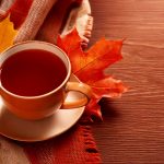 Warm autumn background with cup of tea, vibrant maple leaves, and a plaid blanket with space for text.Autumn cozy composition with cup of tea and leaves in warm orange colors