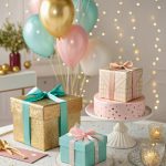 Pastel colored birthday party scene with wrapped gifts, balloons, a pink cake stand, twinkling lights, and delicate ribbons – celebration, gifting, and festive decor ideas