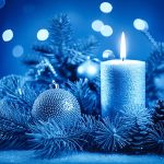 A serene blue-toned holiday arrangement featuring a lit candle, pine branches, a silver ornament, and twinkling lights. Perfect for Christmas ambiance, winter decor, and festive celebrations.