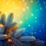 Blue pine branches glowing with tiny lights, set against a vivid yellow-to-blue gradient with copy space. Evokes holiday warmth, celebration, and seasonal cheer for Christmas and winter branding