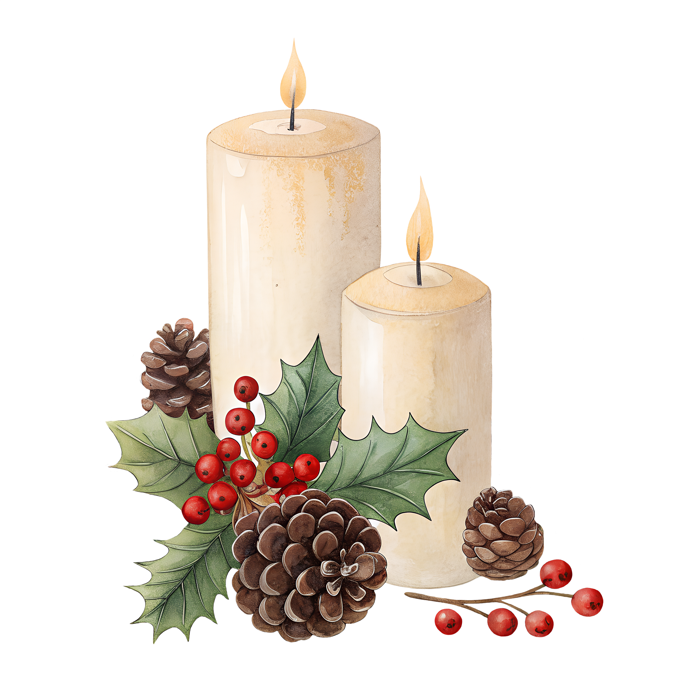 Candles, holly leaves, red berries and pinecones arrangement for Christmas and winter decor on transparent background