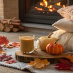 Cozy autumn scene with pumpkins, fall leaves, a knitted blanket, and a warm latte by a glowing fireplace. Perfect for seasonal home decor, comfort, and warmth themes