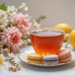 A warm cup of tea paired with colorful macarons, soft pastel flowers and lemons creates an elegant, cozy springtime scene perfect for breakfast, dessert styling, or lifestyle and food photography