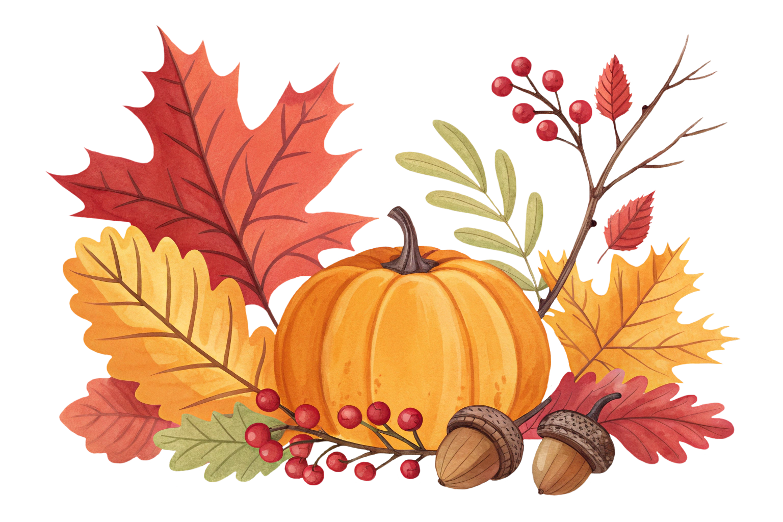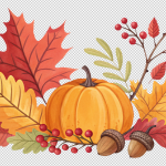 Vibrant autumn still life with bright pumpkin surrounded by fall leaves, berries, and acorns, evoking seasonal warmth and cozy holiday mood on transparent background