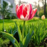 A red and white tulip blooms in a sunlit spring garden bed, surrounded by green leaves, mulch, and soft bokeh background, evoking freshness, beauty, calm, and seasonal renewal