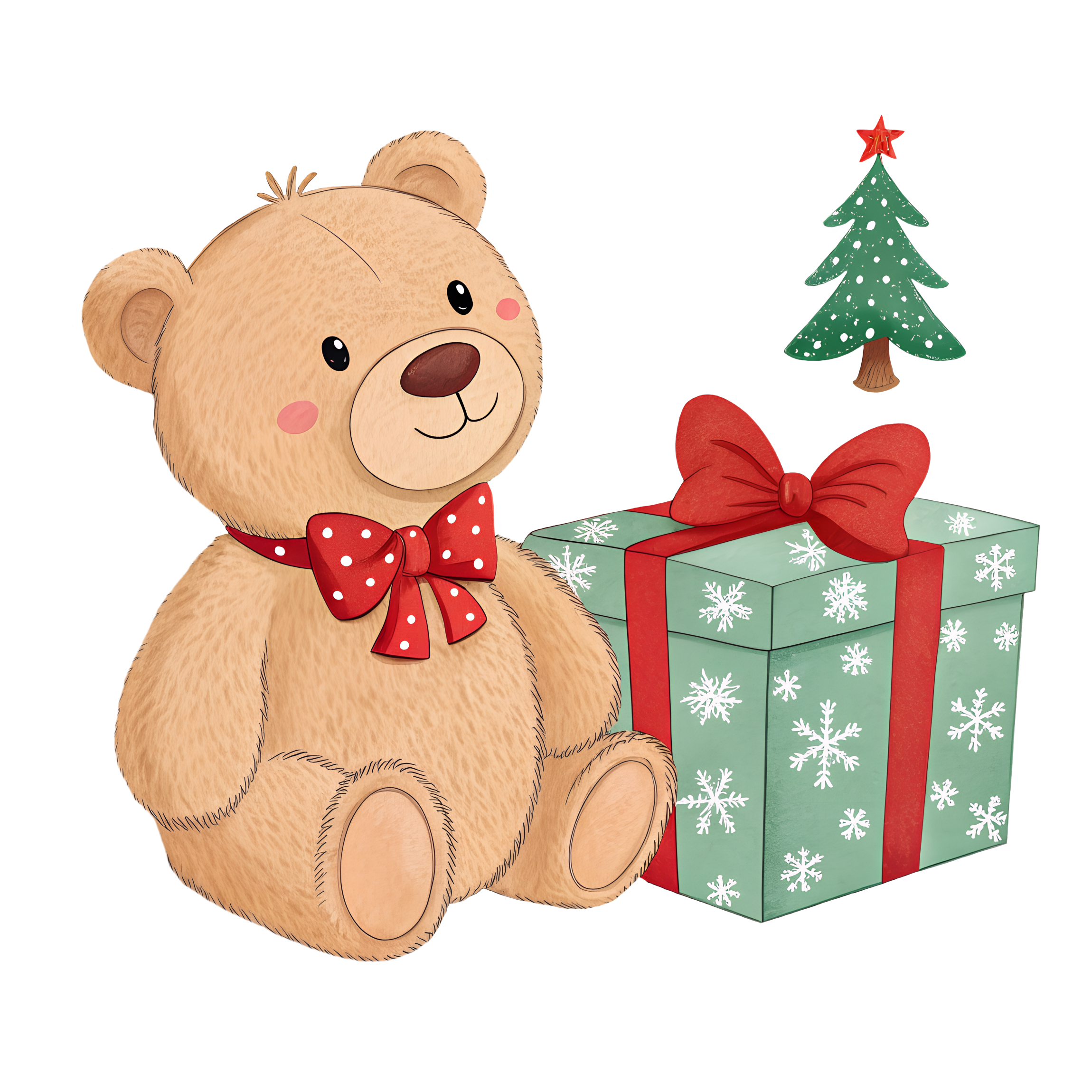 Charming teddy bear sits beside a wrapped gift and a tiny Christmas tree, creating a warm, festive image perfect for family, kids, and holiday campaigns