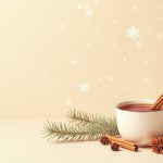 A warm cup of hot cocoa topped with cinnamon sticks sits beside evergreen branches against a soft beige background, evoking cozy winter vibes perfect for holiday and Christmas themes.