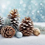 Winter composition featuring frosted pinecones, blue-green fir branches, and a snowy surface with soft snowfall in the background. Ideal for holiday, winter, nature, or Christmas-themed stock projects.
